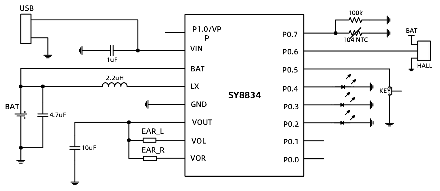 SY8834是專門為TWS耳機(jī)充電倉(cāng)設(shè)計(jì)的全集成SoC芯片。SY8834內(nèi)部集成了兼容8051指令集的CPU,256字節(jié)RAM, 4k字節(jié)OTP程序存儲(chǔ)區(qū),多通道10位ADC,9個(gè)GPIO,一個(gè)線性充電模塊,一個(gè)Boost升壓模塊和兩個(gè)獨(dú)立放電控制MOS管。SY8834芯片VIN管腳支持過(guò)壓保護(hù),最高耐壓可達(dá)35V。