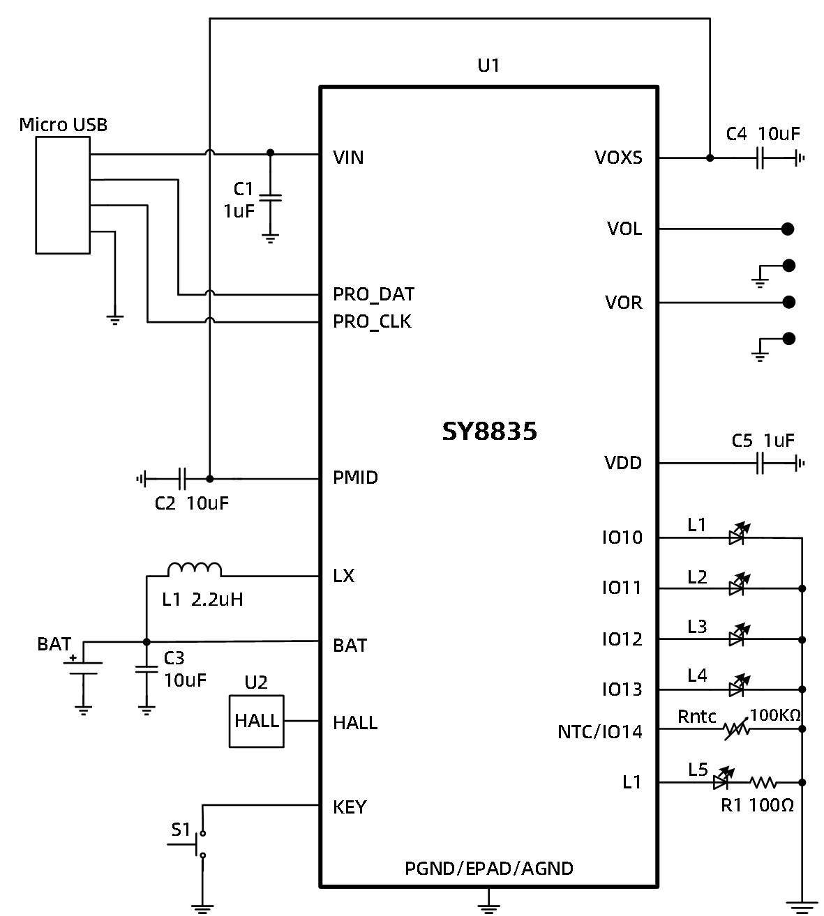 SY8835集成了通信模塊,可以實(shí)現(xiàn)耳機(jī)倉(cāng)到耳機(jī)端的高速通信,非常適合藍(lán)牙耳機(jī)充電倉(cāng)的設(shè)計(jì)。SY8835的高集成度極大簡(jiǎn)化了外圍電路和元器件,為藍(lán)牙耳機(jī)充電倉(cāng)的應(yīng)用提供了簡(jiǎn)單易用的方案。