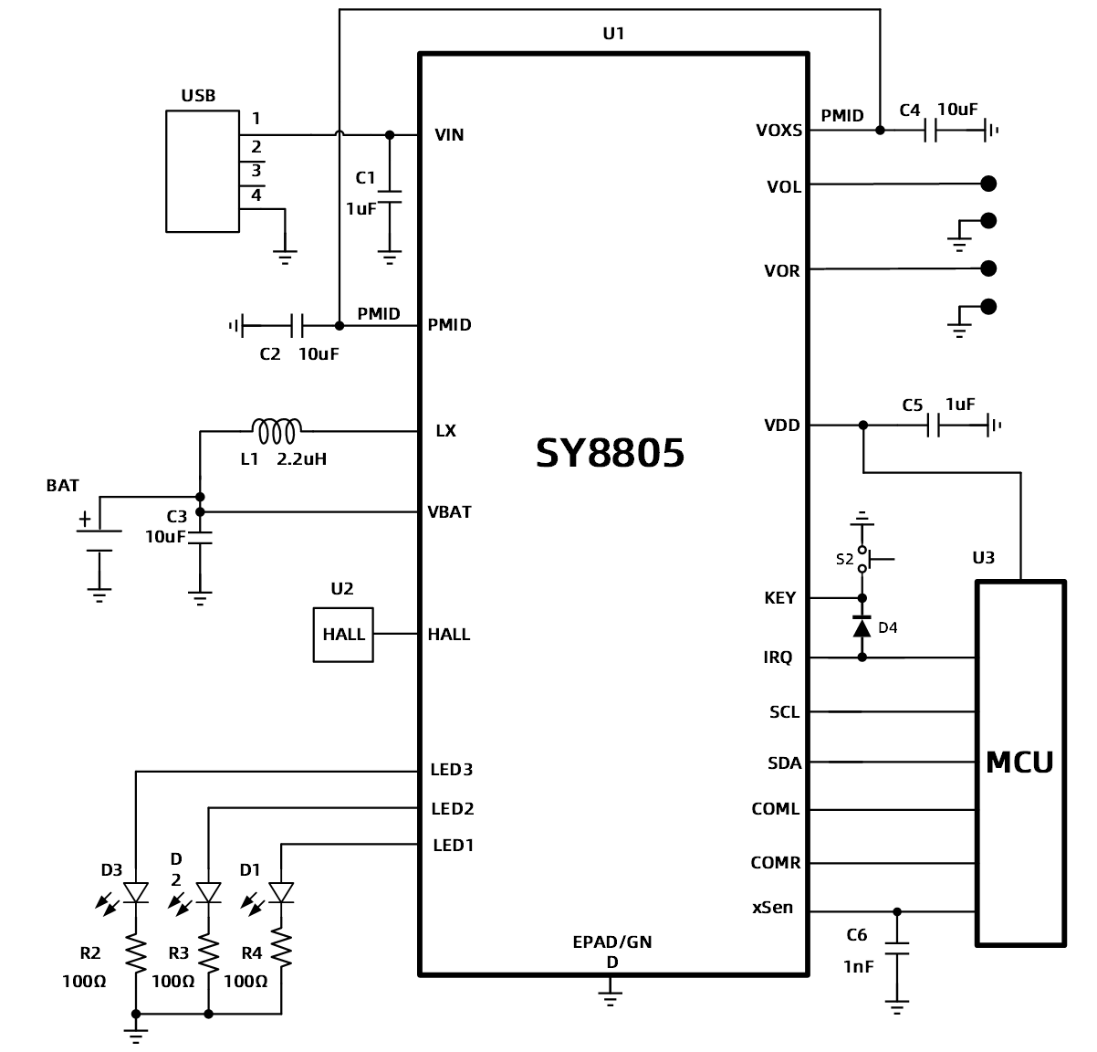SY8805集成了標準的I2C接口,方便實現芯片和MCU之間的通信,控制充電、放電功能。