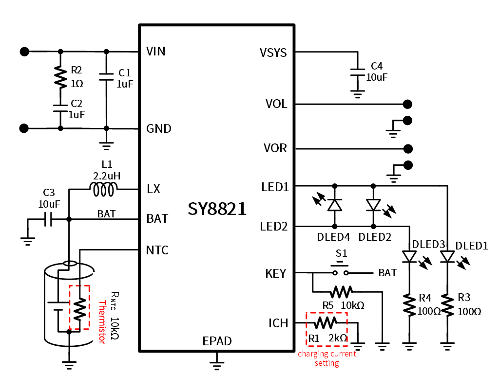 SY8821 supports discharge control through an enable signal EN, so the MCU can control the discharge function of the IC directly through EN. SY8821 integrates a single-wire state code output, which is convenient for the IC to report the IC state to the MCU. SY8821 suits the Bluetooth headset charging compartment perfectly. It greatly simplifies the peripheral circuits and components, providing a simple and easy-to-use solution for charge cradle of Bluetooth earphone.