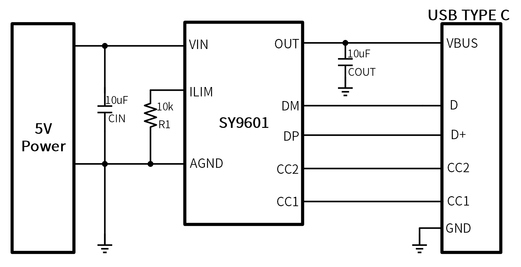 SY9601 is a current-limiting IC integrating Type-C and BC1.2 protocols, with adjustable output limited current, PMOS switch with maximum limited current of 3A, D+/D supporting BC1.2 protocol, which provides automatic identification of mobile phones such as iPhone and Samsung, and ensures maximum charging power. Type-C port output is provided for detecting CC connection before turning on the current limit switch and indicating the maximum output current capability. SY9601 is available in a ESOP8 or DFN10 package.