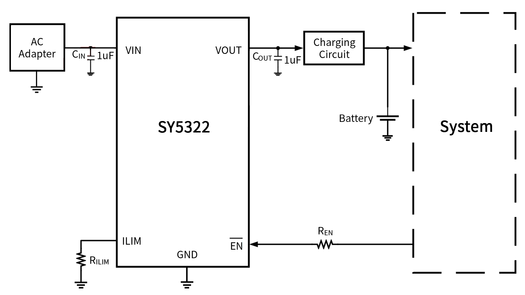 SY5322是一款具有欠壓保護(hù)、過壓保護(hù)、過流保護(hù)、短路保護(hù)以及過溫保護(hù)等特點(diǎn)集一身的高集成IC。SY5322應(yīng)用于充電電路或低壓系統(tǒng)的前端,以避低壓系統(tǒng)免受異常輸入的影響,可承受高達(dá)28V的異常輸入電壓。當(dāng)輸入電壓大于過壓保護(hù)閾值時(shí),IC將在1us內(nèi)快速關(guān)閉內(nèi)部MOSFET,避免后端低壓系統(tǒng)受到異常高輸入電壓的影響; IC可通過ILIM與地連接的電阻限定輸入電流,防止低壓系統(tǒng)的輸入電流過大;同時(shí)SY5322還具有芯片過溫保護(hù),當(dāng)檢測(cè)到芯片溫度超過過溫保護(hù)閾值時(shí),也將關(guān)閉MOSFET,停止供電。